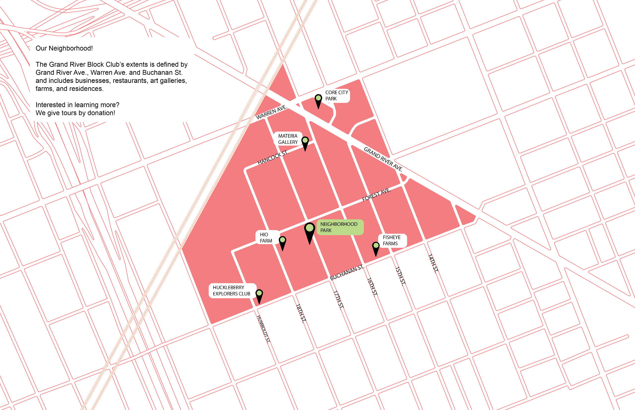 Grand River Block Club is a nonprofit organization and City of Detroit block club that motivates Core City residents to take an active role in shaping the spaces they inhabit, transforming everyday environments into dynamic places of creativity and collaboration.By encouraging our neighbors to work together, these efforts help cultivate a sense of ownership and pride, where the community is not only a passive observer but an integral creator of its surroundings. Shared spaces become more than just physical locations—they evolve into canvases for collective expression and cooperation, where bonds are deepened and new connections are formed.Through our projects, GRBC fosters a strong sense of community within Core City and bridges local efforts with the wider city, facilitating connections that benefit both individuals and the larger urban landscape.